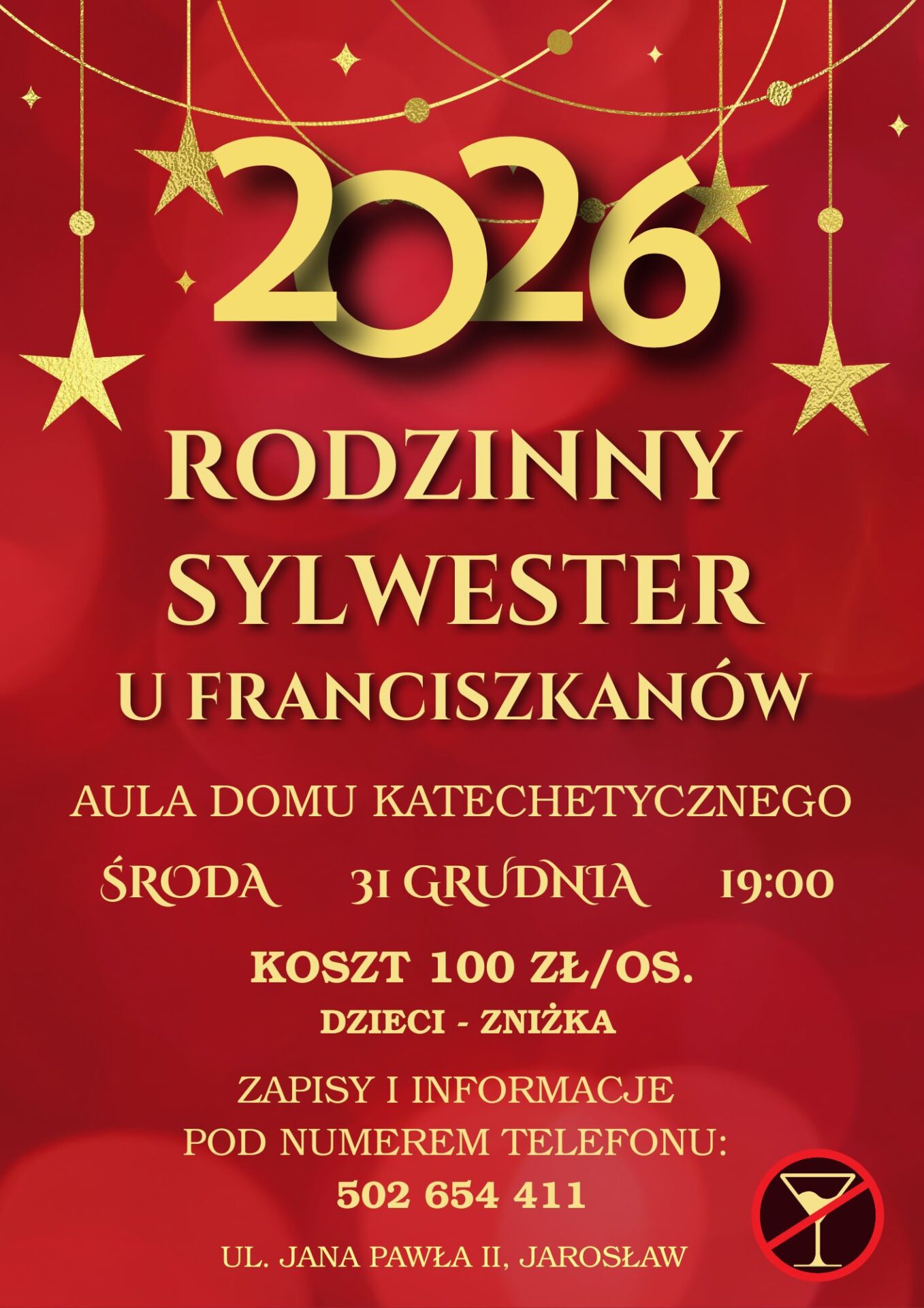Rozpoczynamy zapisy na „Rodzinnego Sylwestra u Franciszkanów”. Zapisy i informacje pod numerem telefonu 502 654 411. Koszt: 100zł/osoba. Dla dzieci przewidziane są zniżki. Początek zabawy o godz. 19:00. Zakończenie ok. 2:00. Zapewnimy dwa ciepłe posiłki, zimną płytę, ciepłe i zimne napoje, noworoczny toast. Impreza jest bezalkoholowa. Wspólnie powitajmy Nowy Rok 2026!
