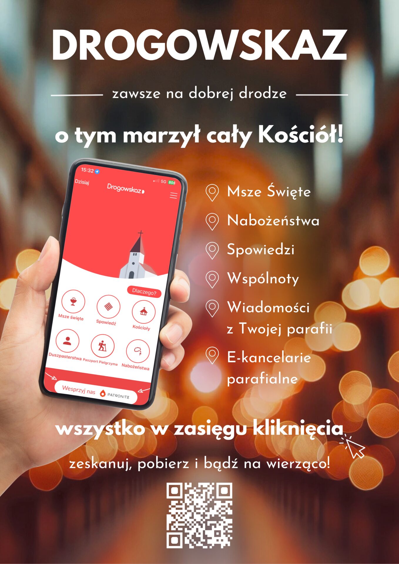 Zachęcamy do pobrania na telefon aplikacji Drogowskaz, oraz wybrania naszego kościoła jako „swojego”. W aplikacji dostępne są wszystkie najpotrzebniejsze informacje o naszym kościele m.in. godziny Mszy św., spowiedzi, ogłoszenia duszpasterskie i aktualności. Poza tym będąc w innym mieście bardzo łatwo można sprawdzić gdzie i kiedy można pójść na Mszę św. Aplikacja jest darmowa i nie zawiera reklam.