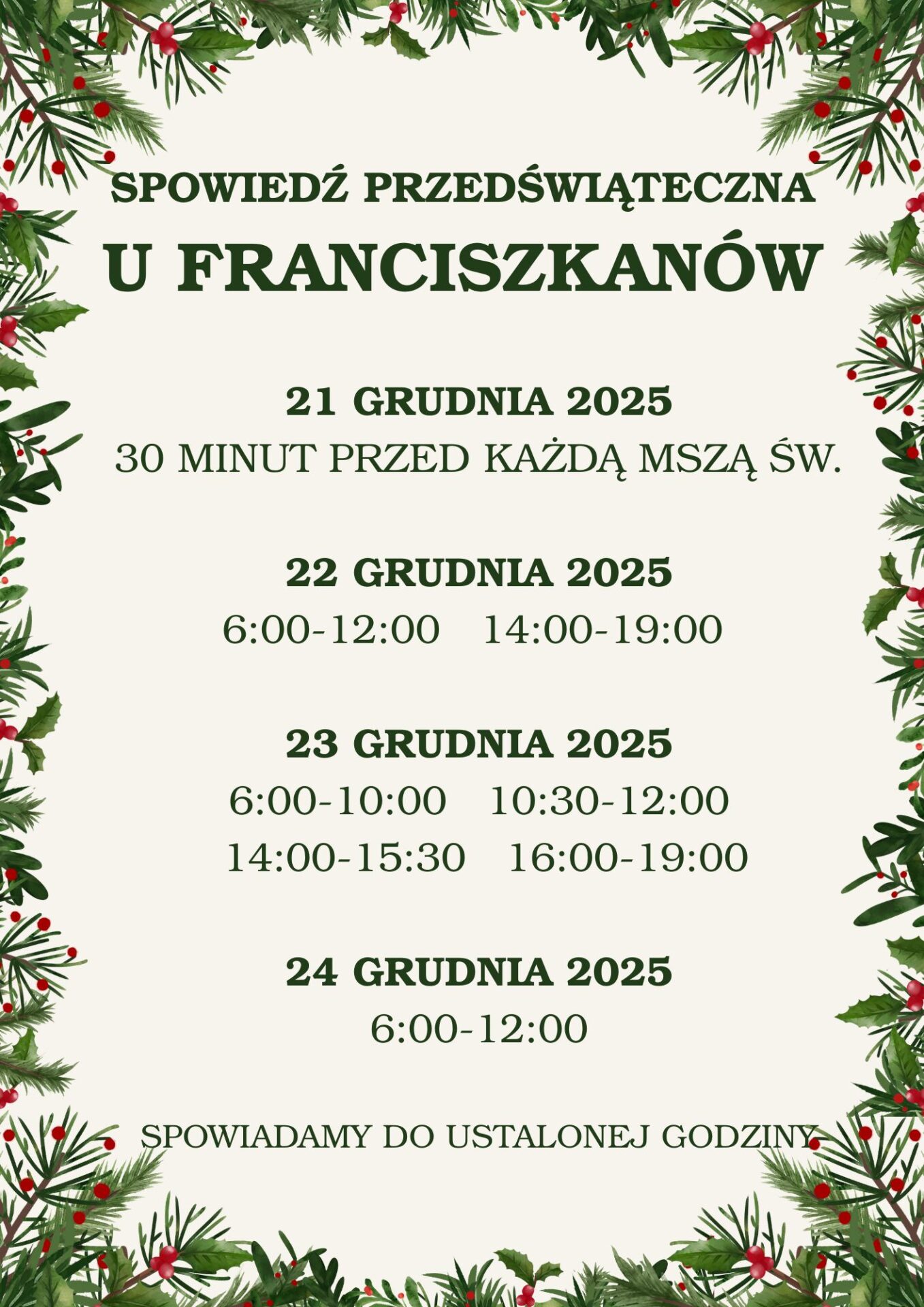 Spowiedź przedświąteczna w Jarosławiu 19.12.2025 (piątek) Tywonia 14:30 – 17:30 Łazy Kostkowskie16:00 – 17:30 Wygarki15:30 – 17:30 20.12.2025 (sobota) Pełkinie 15:30 – 18:00 Pawłosiów 15:30 – 17:30 Parafia Chrystusa Króla 10:00 – 12:00 i 15:00 – 17:00 22.12.2025 (poniedziałek) Wólka Pełkińska 14:00-18:00 Przedmieście Dolnoleżajskie 15:00 – 17:00 Parafia Miłosierdzia Bożego 10.00 – 12.00 i 15.00 – 18.00 23.12.2025 … Czytaj dalej